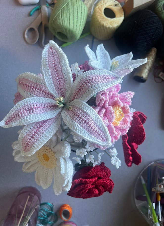 Hand-crafted and made to order, these unique crochet bouquets offer a timeless alternative to traditional flowers. Perfect for special occasions or as a lasting home decor piece, each bouquet is personalized to your color and style preferences, ensuring a one-of-a-kind, ever-lasting floral arrangement. Ideal for gifts or personal keepsakes.